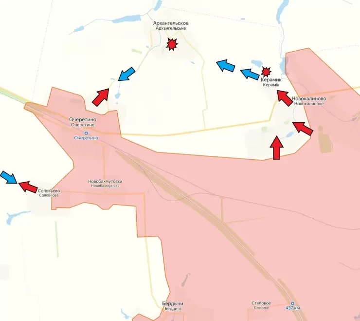 На Авдеевском фронте ВС РФ в Нетайлово и у Уманского ведут встречные бои, пока без перемен. Сейчас ВС РФ выровняли фронт между Бердычами и Новобахмутовкой, двигаются от Бердычей в сторону Новопокровки и Новосёлки первой. От Очеретино и Соловьево ВС РФ наступают на запад - к Соколу. На северо-западе - село Новоалександровка, где наши двигаются по окраине вдоль ж/д на запад. На севере от Очеретино - Архангельское, подступиться к нему с наскока нашим не удалось. Судя по движению армии России от Новокалиново и Керамика, Архангельское наши будут обхватывать в клещи. ВСУ пытаются контратаковать, но довольно вяло. При этом никакой выстроенной обороны у ВСУ здесь нет.