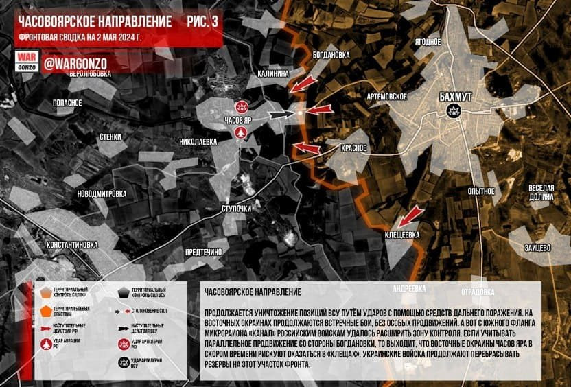 На Артемовском направлении российским войскам удалось продвинуться и закрепиться на восточной окраине Часов Яра. Уничтожаются укрепления и позиции противника при помощи Воздушно-космических сил РФ.