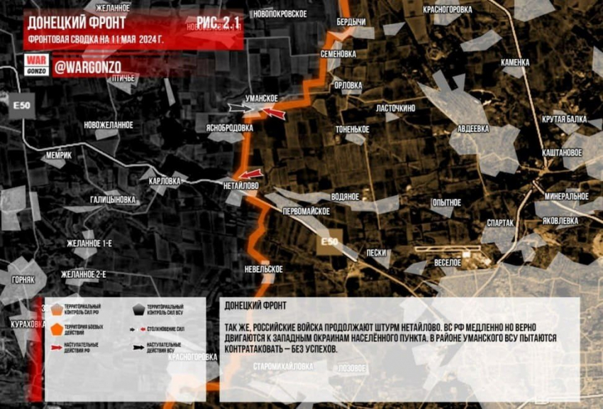Российские войска продвинулись к северу от Очеретино более чем на 1 км и заняли часть Уманского. Успехи также зафиксированы в Новопокровском и южнее лесопосадки.