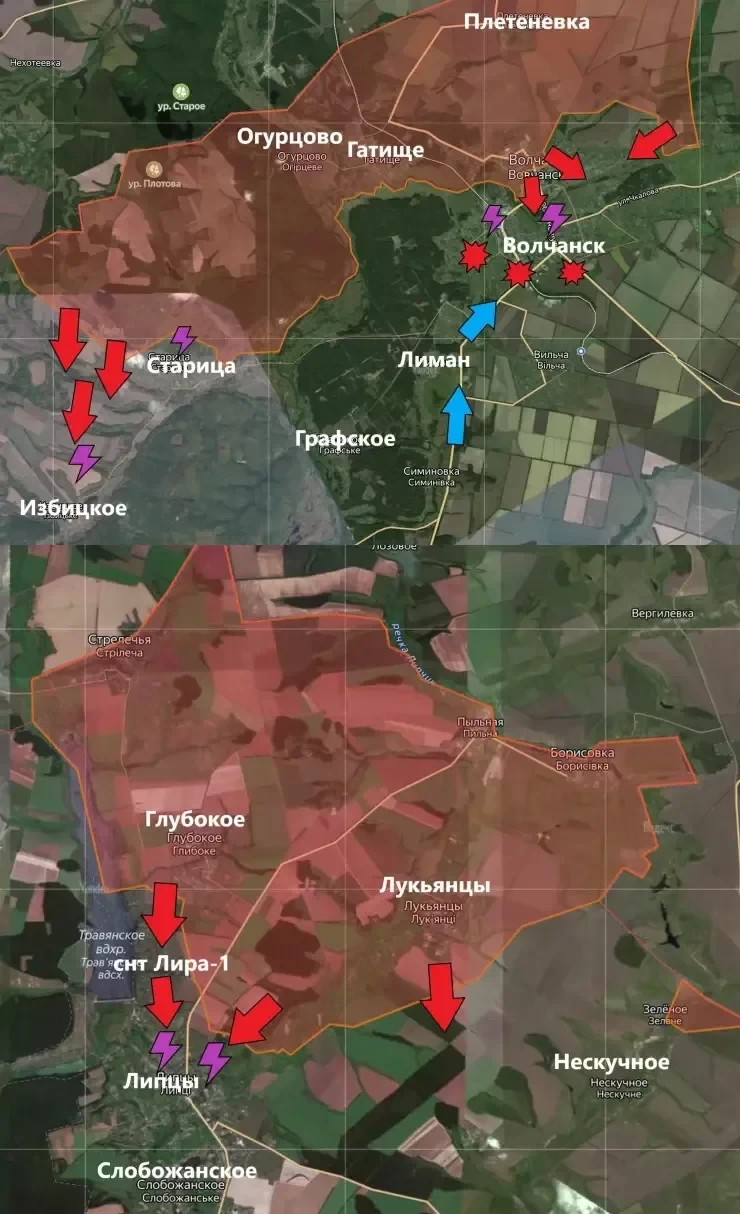 На Харьковском направлении в районе Липцев продолжаются активные боевые действия. Атака российскими войсками к югу от Лукьянцев с использованием пехоты. Продвижение ВС РФ в направлении к Липцам составило до 2,5 км. Тяжелые бои продолжаются в Волчанске, где украинские войска пытаются удержать позиции.