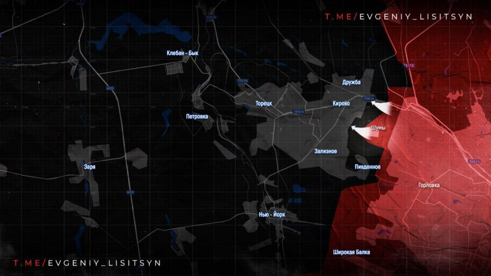 Важные события происходят на Торецком направлении. По данным военкора Евгений Лисицына, российские войска успешно наступают на Торецкую агломерацию с двух сторон: от железнодорожной станции «Майорская» и из-под шахтерского поселка Южное. В обход шахты и отвалов наши бойцы прорвались в Дружбу, на окраину микрорайона Кирово (улица Маяковского), а также в Железное. Командование ВС РФ планирует окружить подразделения ВСУ в микрорайоне Северное, пишет военкор в своем Telegram-канале.