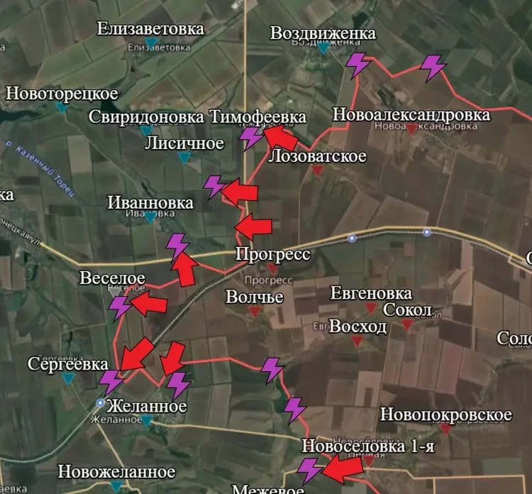 На Покровском направлении ВС РФ удалось выбить противника из центра поселка Веселое. Также наши войска продвирулись к северо-западной окраине Желанного и опорнику восточнее. Также российские силы все ближе к стратегическому маршруту снабжения ВСУ в Донбассе - трассе Покровск-Константиновка. После взятия села Лозоватское российским войскам до этой дороги осталось всего 6 км. Она служит важным маршрутом снабжения других удерживаемых украинской армией рубежей: города Часов Яр и Константиновка.