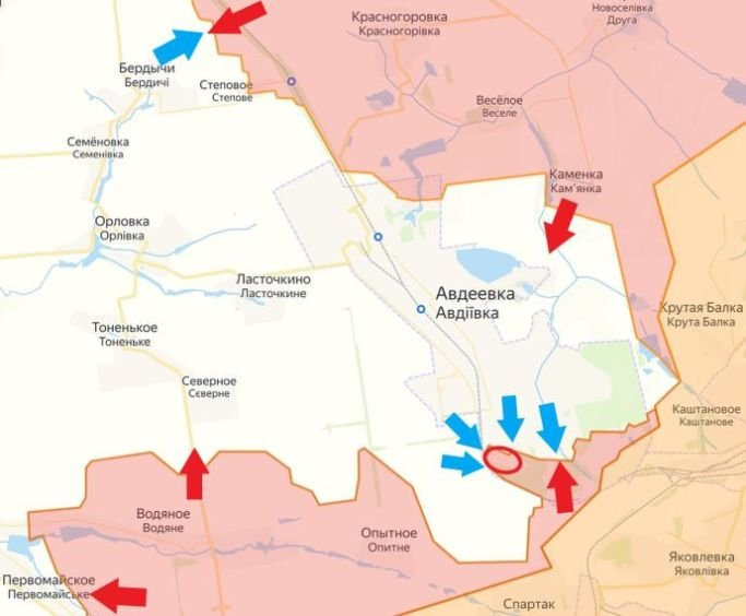 Самым напряжённым местом на Авдеевском участке остаётся южный район Авдеевки, где удалось закрепиться российским военнослужащим. Украинские войска то и дело пытаются отбить важные позиции, но у них это не получается. Что касается северного фланга Авдеевки, то здесь не утихают встречные бои в районе Бердычей. Также зафиксировано продвижение ВС РФ по улице Ворошилова в Первомайском, где удалось установить контроль над несколькими опорными пунктами противника.