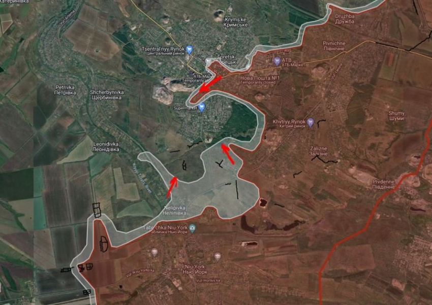 Российские войска давят западнее Синьковки в направлении северо-западной окраины Петропавловки.