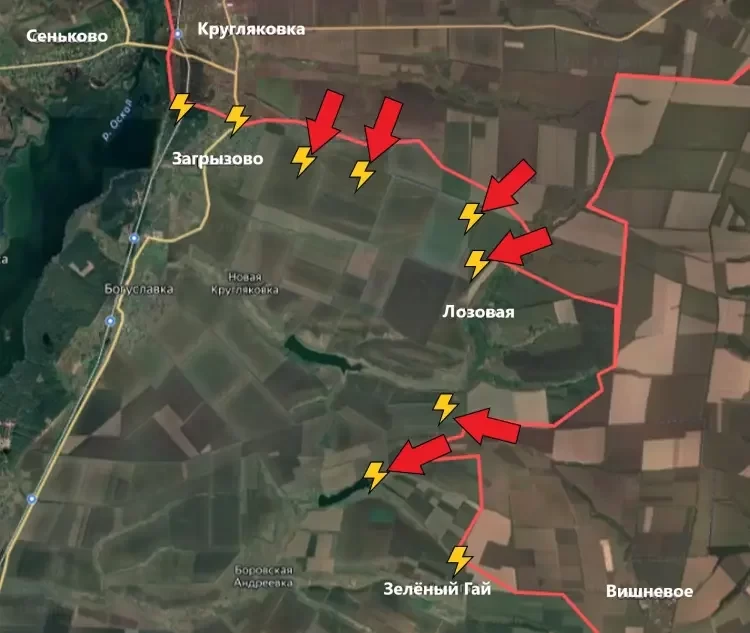 На Боровском направлении подразделения ВС РФ продвинулись восточнее Загрызово. Если движение в этом направлении на этом участке продолжится, то у ВСУ в Загрызово и Лозовой намечаются серьёзные проблемы.