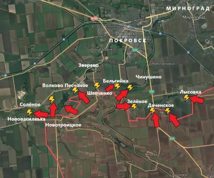 Наиболее активно продвижение идёт в западной части. Враг сообщает, что нашим бойцам удалось продвинуться на север от Новотроицкого, форсировав реку и выйдя к окраинам Волково. Сейчас бои идут за позиции у трассы на Покровск. Также наши бойцы закрыли «карман» между Новотроицким и Песчаным. У самого Песчаного идут бои на подступах к селу, сообщает PulsePen.