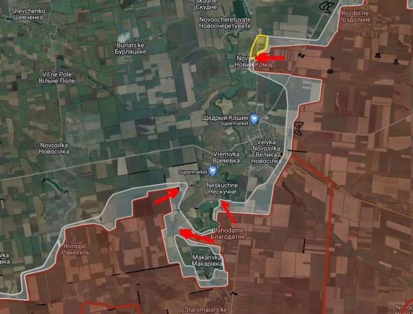 На Великоновосёлковском направлении ВС РФ имеют тактические успехи в Новый Комар, ведут штурмовые действия в центральной части населенного пункта.