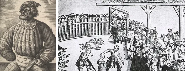 Фото слева: Портрет Клауса Штёртебекера. Источник: Metropolitan Museum of Art. Художник: Daniel Hopfer (1470–1536). Фото справа: Казнь пирата Клауса Штёртебекера (ок. 1360-1401) и семидесяти его сообщников из Виталиенского братства, лидером которого он был, 20 октября 1401 года в Гамбурге. Гравюра по мотивам популярного изображения конца XVI века. Поль Лакруа, Париж, 1878 год.