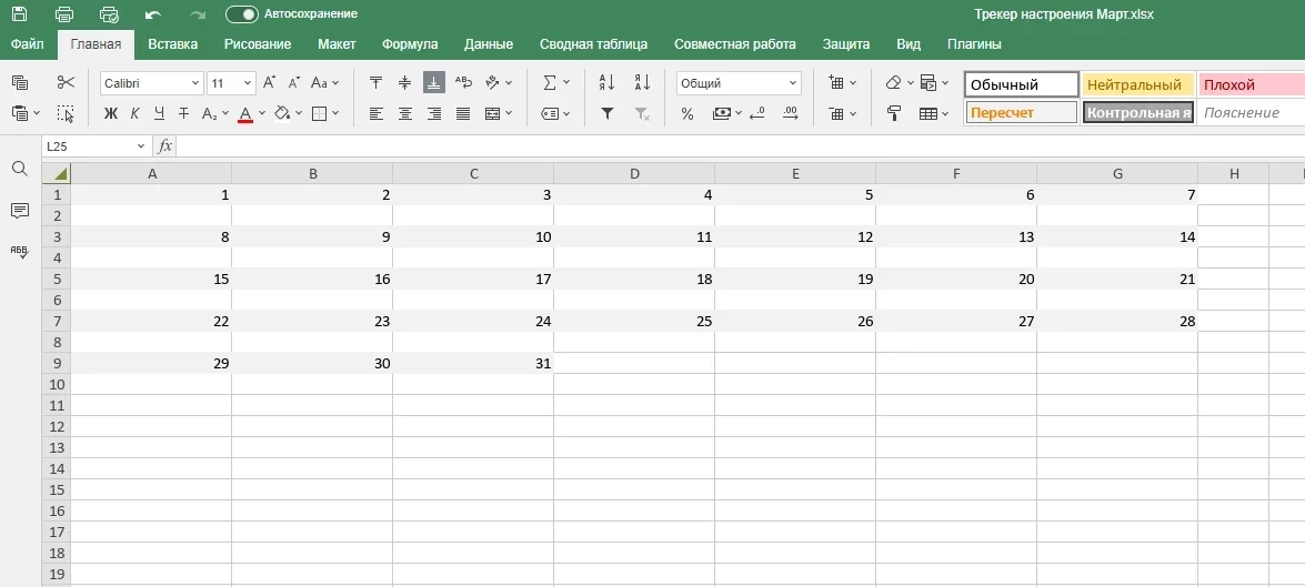 Разметьте лист, распределив его по неделям и дням. Каждая неделя должна занимать семь строк, а в первой колонке указывайте даты до 31-го числа.