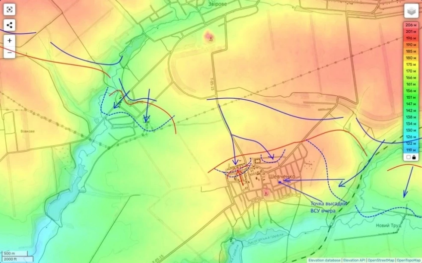 На карте я указал точку высадки противника, о которой идет речь. В это самое время части 74 бригады дочищали северо-восточную часть села. Собственно, чтобы сорвать этот процесс и была произведена эта самоубийственная высадка. И все ее участники к ночи были уничтожены.