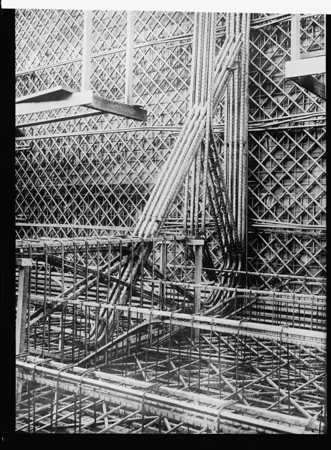 Железобетон представляет собой комплексный строительный материал, состоящий из бетона и арматуры (стальные стержни, проволока, тканые сетки и т. п.). Необходимость применения арматуры вызвана тем, что бетон сопротивляется растяжению в 10-15 раз хуже, чем сжатию, поэтому предусматривается работа бетона на сжатие, а арматуры — на растяжение.