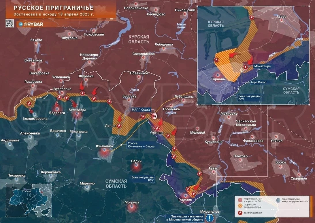 На Сумском направлении российские войска ведут бои в районе Горнали и Горнальского Николаевского Белогорского монастыря.