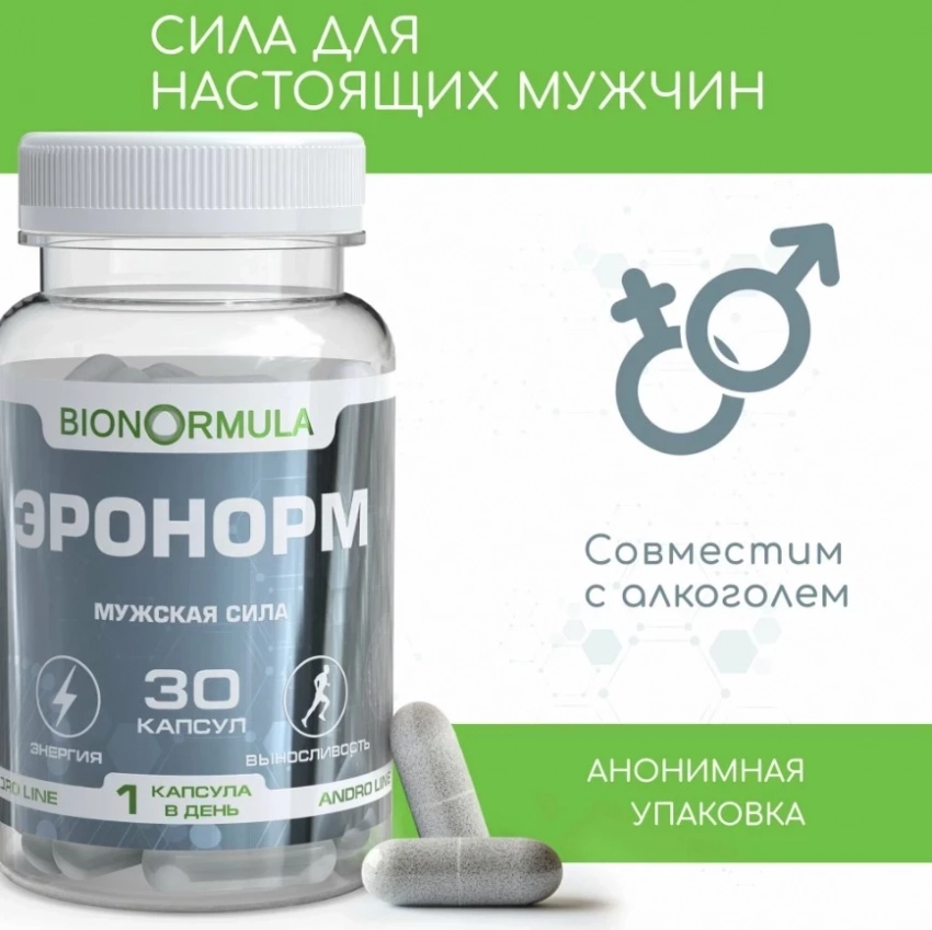 Эронорм от Bionormula — это эффективный биологически активный комплекс, который помогает восстановить эрекцию при психогенной эректильной дисфункции и поддерживает мужскую силу. В составе — мощные афродизиаки, такие как экстракты эврикомы и эпимедиума, а также гомогенат трутневого, цинк, женьшень и L-аргинин, которые способствуют повышению уровня тестостерона, улучшению кровообращения и повышению выносливости. Препарат работает накопительным эффектом, не вызывает побочных действий и совместим с алкоголем, что делает его удобным для использования в повседневной жизни.