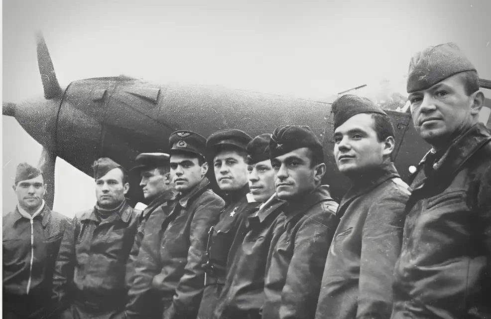Амет-хан (сидит слева) среди командиров эскадрилий 303-й истребительной авиадивизии, осень 1944 г.