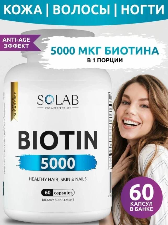 Biotin от Solab — это идеальная добавка для тех, кто борется с выпадением волос и ломкостью. Витамин B7 (биотин) в дозировке 5000 мкг поддерживает не только волосы, но и кожу, укрепляя её упругость и эластичность. Он активно способствует синтезу кератина, из которого состоят волосы, улучшая их структуру. Биотин помогает избавиться от перхоти и стимулирует рост волос, предотвращая их выпадение. Этот продукт заслуженно занимает место в рейтинге бадов для волос.