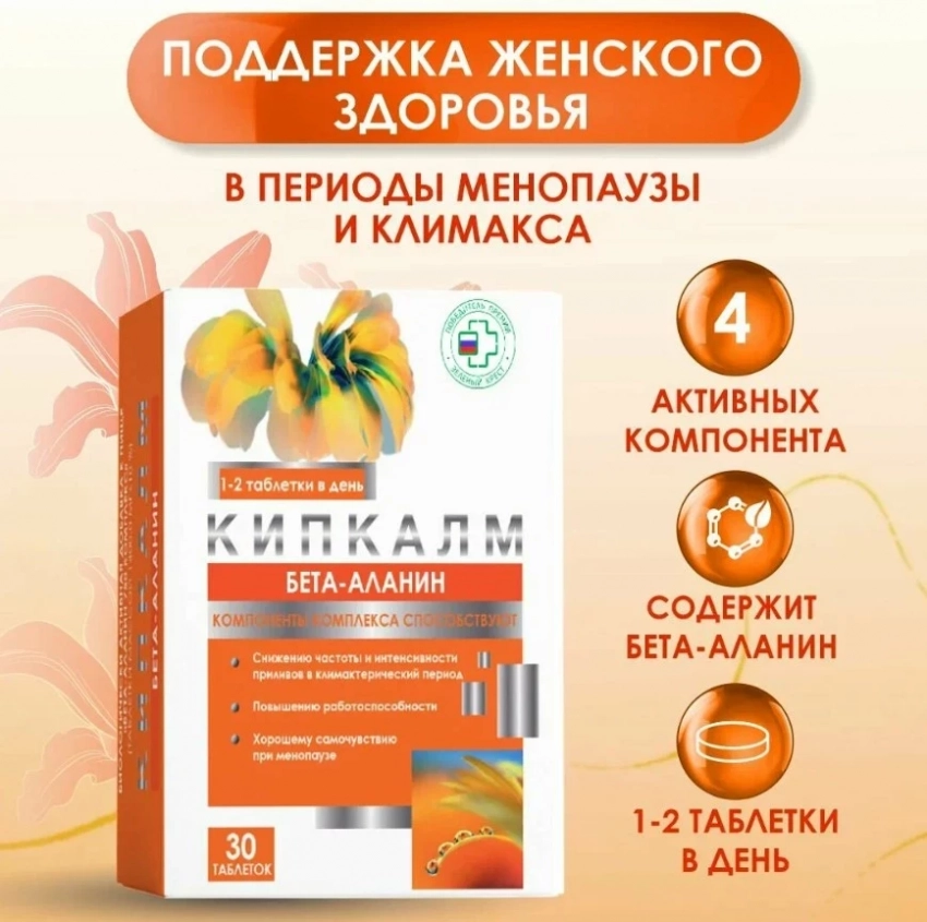 В период гормональной перестройки Кипкалм становится надежным помощником благодаря уникальной комбинации бета-аланина, изофлавонов сои и витаминов D3 и В9. Бета-аланин напрямую воздействует на терморегуляцию, значительно уменьшая частоту и интенсивность приливов, в то время как фитоэстрогены сои мягко корректируют гормональный дисбаланс. Витаминный комплекс дополнительно поддерживает нервную систему, костную ткань и обменные процессы. Удобная схема приема (1-2 таблетки в день) и быстрый эффект (улучшения заметны уже через 1-2 недели) делают этот БАД популярным среди женщин в менопаузе.
