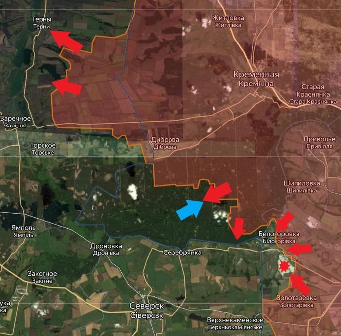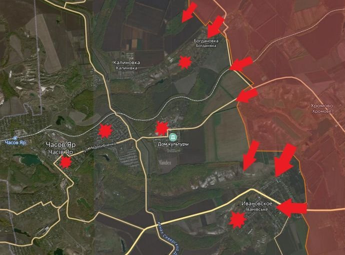 На Артёмовском направлении ВС РФФ имеет успешное продвижение к Красному с востока и севера. Так же атаковали северо-запад от Клещеевки и Андреевки.