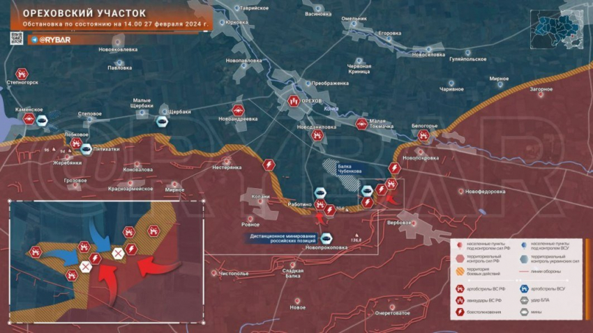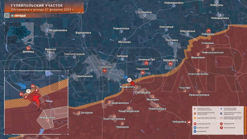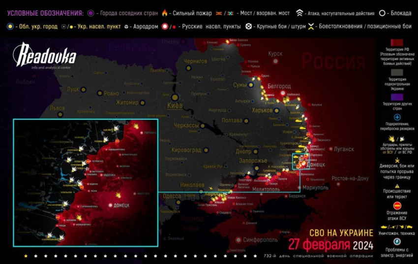 Уточнённая карта боевых действий на Украине по данным на 06:00 мск сегодня, 28 февраля 2024