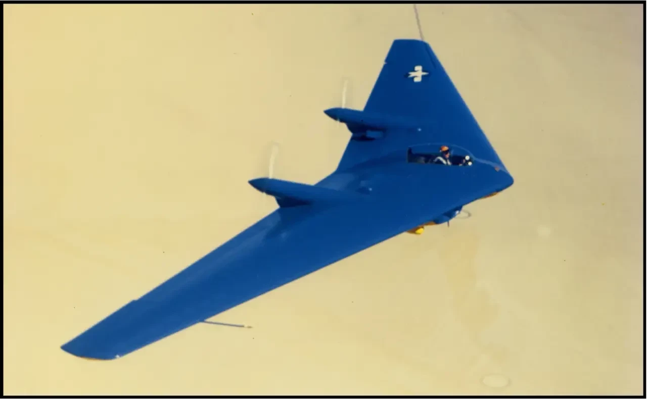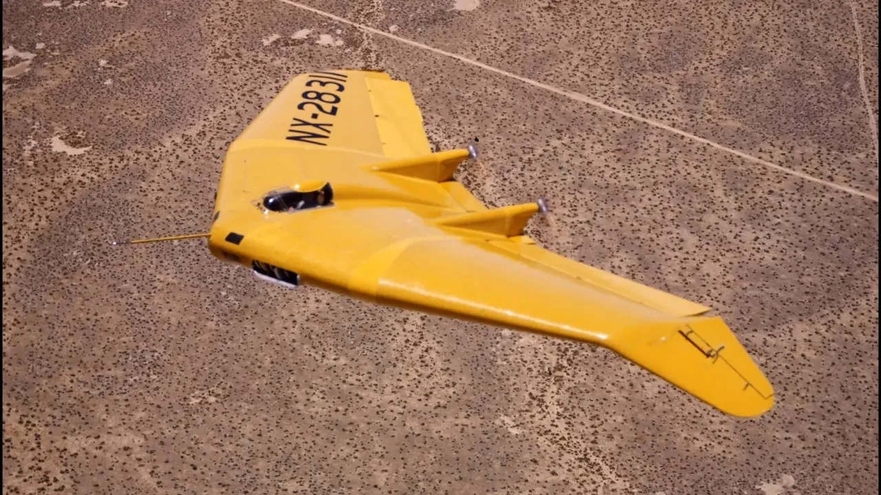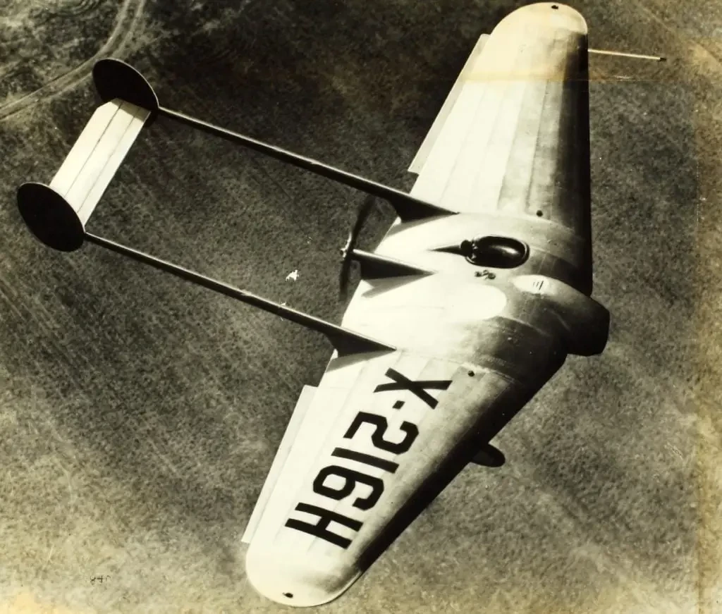 Окрашенный в желтый самолет Джека Нортропа N-1M, доказывающий, что конструкция крыла управляема, и данные, собранные во время этих испытательных полетов, были использованы при проектировании будущих летающих крыльев, таких как N-9M и бомбардировщик XB-35. Обратите внимание, что законцовки крыла направлены вниз, угол вручную регулировался на земле для проверки устойчивости планера.