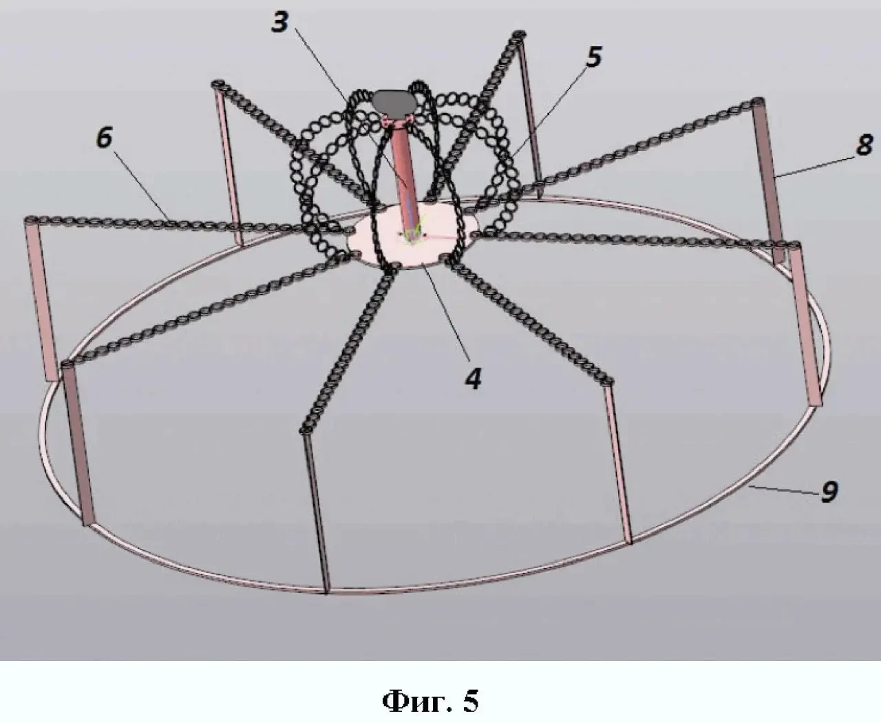 Устройство содержит центральный шток, направляющие обручи, цепи вертикального и горизонтального вращения, диск для крепления цепей вертикального и горизонтального вращения, ступицу, вертикальные трубы, ограничительный обруч. Направляющие обручи жестко закреплены на верхней части каркаса, центром обручей является центральный шток с закрепленным на нем в нижней части диском для крепления цепей. Шток размещен на центральной верхней части транспортного средства и соединен со ступицей. Вертикальные цепи вторыми концами закреплены на верхней точке штока, горизонтальные цепи вторыми концами жестко соединены с вертикальными трубами.