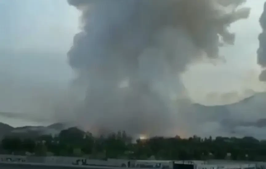 В сети опубликованы кадры, на которых можно увидеть возгорания и мощные взрывы на иранском военном аэродроме в окрестностях города Тебриз на северо-западе страны. По некоторым данным, именно на этой авиабазе были размещены первые Су-35, поставленные Россией. Для самолетов были специально построены простые защитные ангары.