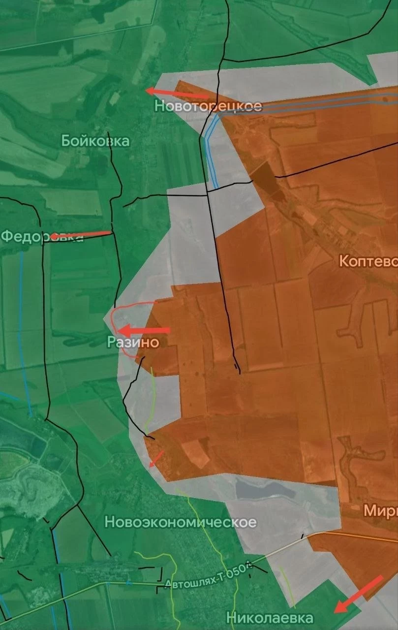 На Покровском направлении идут бои вдоль границы с Днепропетровщиной, но особых прорывов пока нет. Идёт зачистка обширной территории от Орехово до Алексеевки, Зелёного Кута и Новоукраинки. В Муравке встречные бои, противник оказывает серьёзное сопротивление. Южнее Удачного наши штурмовики продвигаются к западным окраинам села, чтобы перерезать дорогу на Молодецкое. На восточном фланге идут интенсивные бои в Разино и Новоторецком, а также в районе восточной окраины Фёдоровки. ВСУ контратакуют в районе Миролюбовки, сообщают, что они зацепились в северной части села. В Новоэкономическом встречные бои.