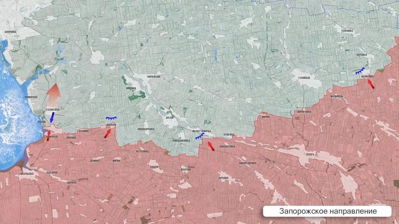 На Запорожском участке ВС РФ наступают на северных окраинах Каменского. Тяжелые бои на подступах к Плавням, к которым наши стараются продвинуться, а ВСУ контратакуют.