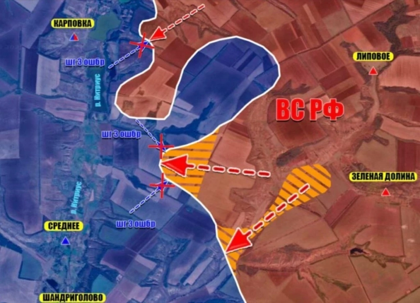 На Краснолиманском направлении ВС РФ расширяют зону контроля с опорой Зелёную Долину, чтобы срезать выступ в районе Пески Радьковские и выйти к Осколу. Для этого предстоит прорвать основной рубеж обороны ВСУ у Оскольского водохранилища. Пока же наши вышли к первым позициям этого рубежа по руслу реки Нитриус на линии Глущенково-Шандриголово-Новосёловка. На этом участке река имеет наибольшую ширину, а вот выше по течению, у Глущенково, практически пересыхает, там наши и атакуют на рубеже Глущенково-Новый Мир.