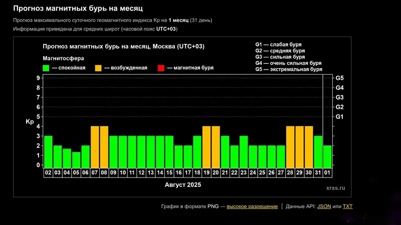 В остальные дни месяца, включая начало (2-6 августа) и конец (3-31 августа), геомагнитный индекс будет держаться в пределах 2-3, что считается спокойным уровнем.