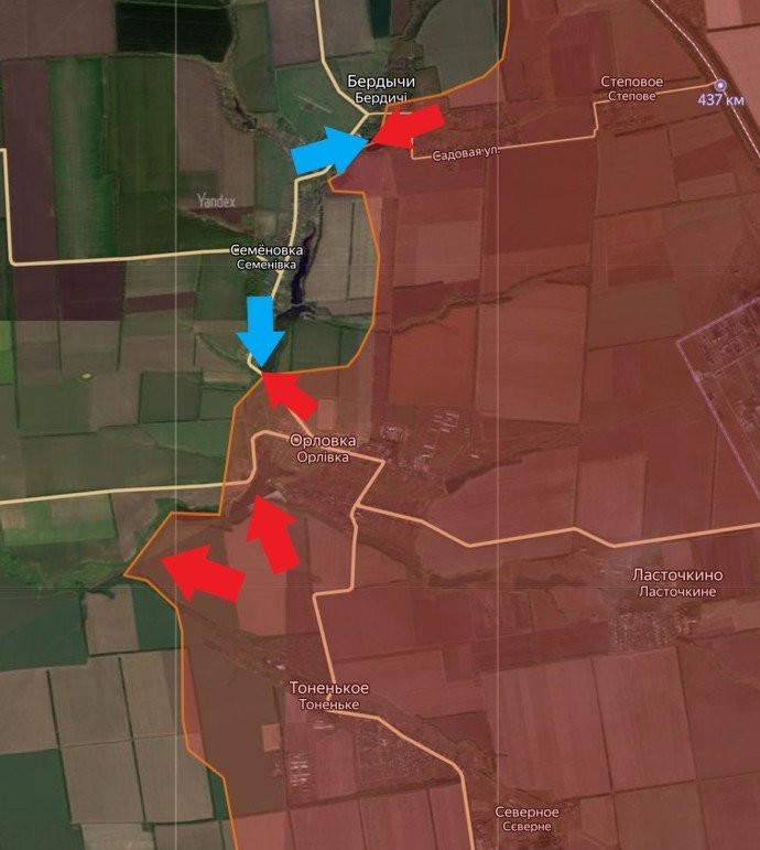 Вместе с этим Вооружённые силы Российской Федерации (ВС РФ) планомерно продвигаются на север в районе Орловки и Тоненького. На данном участке Вооружённые силы Украины (ВСУ) контролируют только Семёноввку. Украинские войска всеми силами пытаются создать новые оборонительные линии.