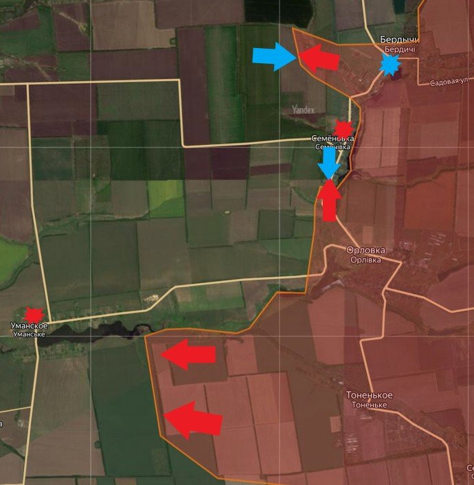 Вооружённым силам Российской Федерации (ВС РФ) удалось провести несколько успешных операций и полностью установить контроль над населённым пунктом Бердычи. Это позволяет российской армии двигаться в направлении Семёновки с севера, что позволить быстрее освободить и этот населённый пункт.