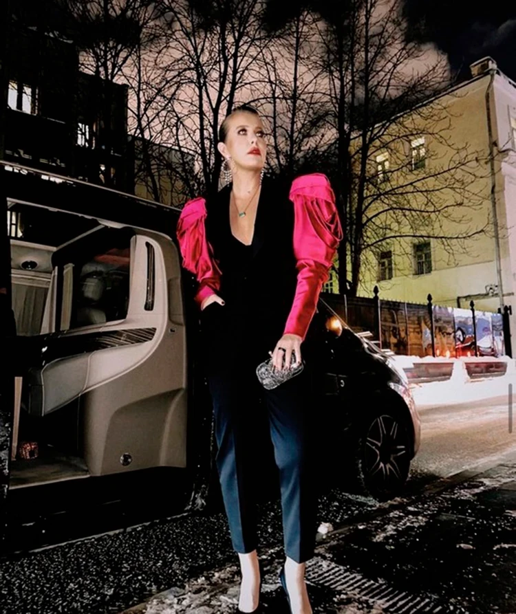 И снова фуксия! Приталенный жакет с акцентными розовыми рукавами-буфами Ксения сочетала с классическими брюками и темными лодочками. Дополнила образ крупными серьгами-кольцами и подвеской с изумрудом. Плюс оригинальный серебристый клатч.