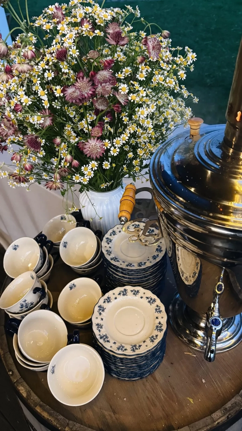 Свадьба Кристины ХоронжукПразднование прошло в деревне Ожигово в Подмосковье на территории гастропространства шеф-повара Дмитрия Парикова "На Даче". Гостей угощали разнообразными закусками, сезонными фруктами и ягодами и поили чаем из самовара. При оформлении декора вдохновлялись местной природой: пространство было украшено полевыми цветами, а узоры на посуде повторяли мотивы. На свадьбе собрались только родственники и близкие друзья пары.