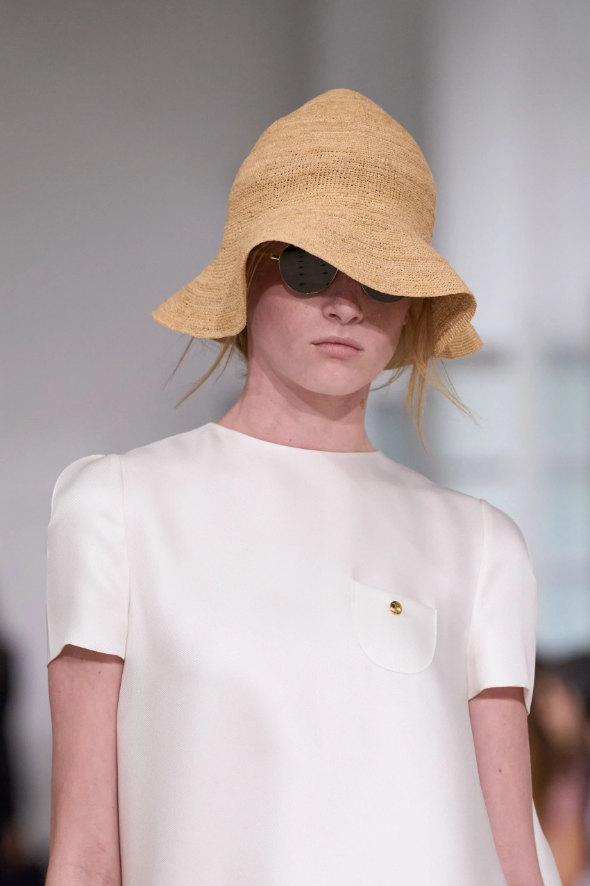 Наоми позировала фотографам в коротком платье в клетку и кожаной куртке и сидела в первом ряду вместе с Кейт Стирлинг, главой агентства IMG Models, в котором состоит Кай. Сын актрисы прошёлся по подиуму в белом платье макси свободного кроя. Образ дополнили соломенная панама, сумка и ювелирные украшения.