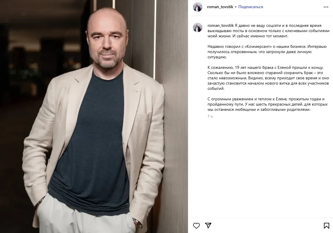 Роман ТовстикПолина Диброва (слева) на выписке Елены Товстик из роддомаПримечательно, что сам Товстик уже сообщил о разводе с Еленой, опубликовав соответствующий пост в инстаграме*: "К сожалению, 19 лет нашего брака с Еленой пришли к концу. Сколько бы ни было вложено стараний сохранить брак – это стало невозможным. Видимо, всему приходит своё время, и оно зачастую становится началом нового витка для всех участников событий. С огромным уважением и теплом к Елене, прожитым годам и пройденному пути. У нас шесть прекрасных детей, для которых мы останемся любящими и заботливыми родителями".