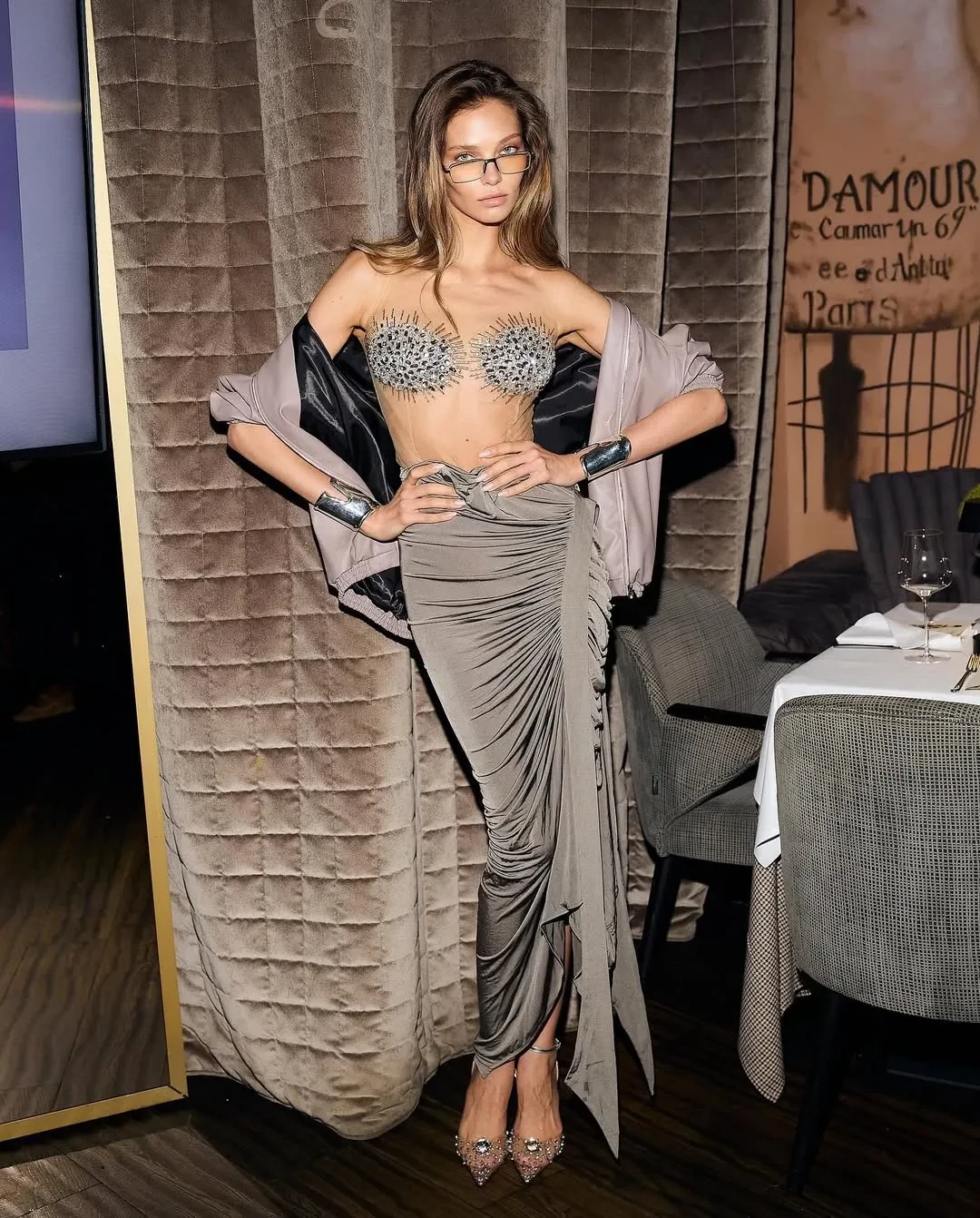 26-летняя Алеся Кафельникова позировала фотографам в лифе с кристаллами Yanina и облегающей юбке, а 36-летняя Мария Миногарова, которая скоро выходит замуж за Александра Горчилина, пришла в жакете Balenciaga и колготках в горох. На образ модель и блогершу, как она рассказала в сторис*, вдохновила Хейли Бибер.