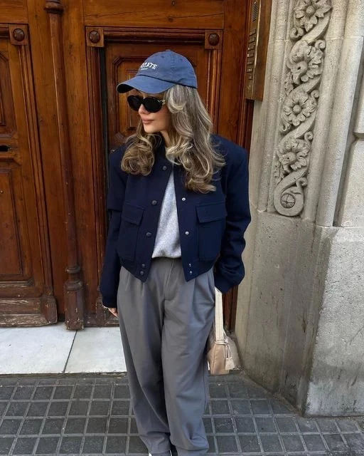 Бомбер и классические брюки — сочетание, в котором строгость встречается с комфортом. Зауженные брюки со стрелками и лаконичный бомбер отлично подойдут для офиса или деловой встречи.