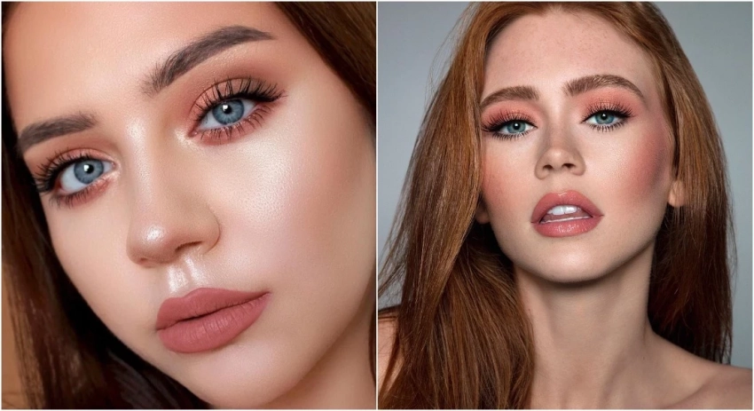 - Голубые глаза: персиковый, теплый розовый, медный.